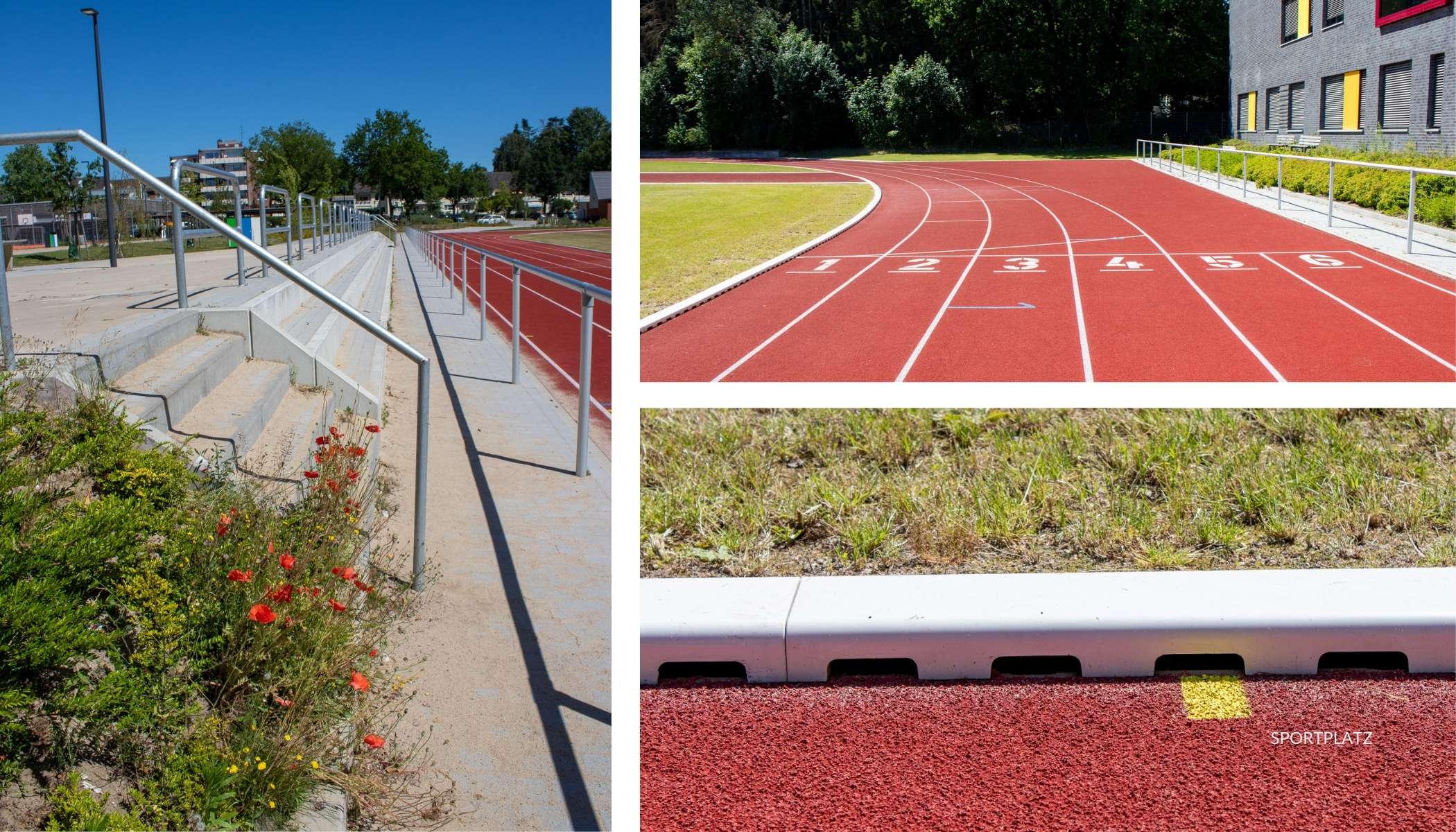 Die sanierte Wettkampfbahn hat eine neue Tribüne erhalten, optimierte Sportflächen und ein integriertes Beachvolleyballfeld. Die Stellplatzanlage wurde erweitert, verkehrlich neu organisiert und durch Begrünung sowie versickerungsfähige Beläge ökologisch aufgewertet. Klare Wegeführungen trennen Fuß , Rad und PKW-Verkehr und schaffen eine sichere Erschließung.