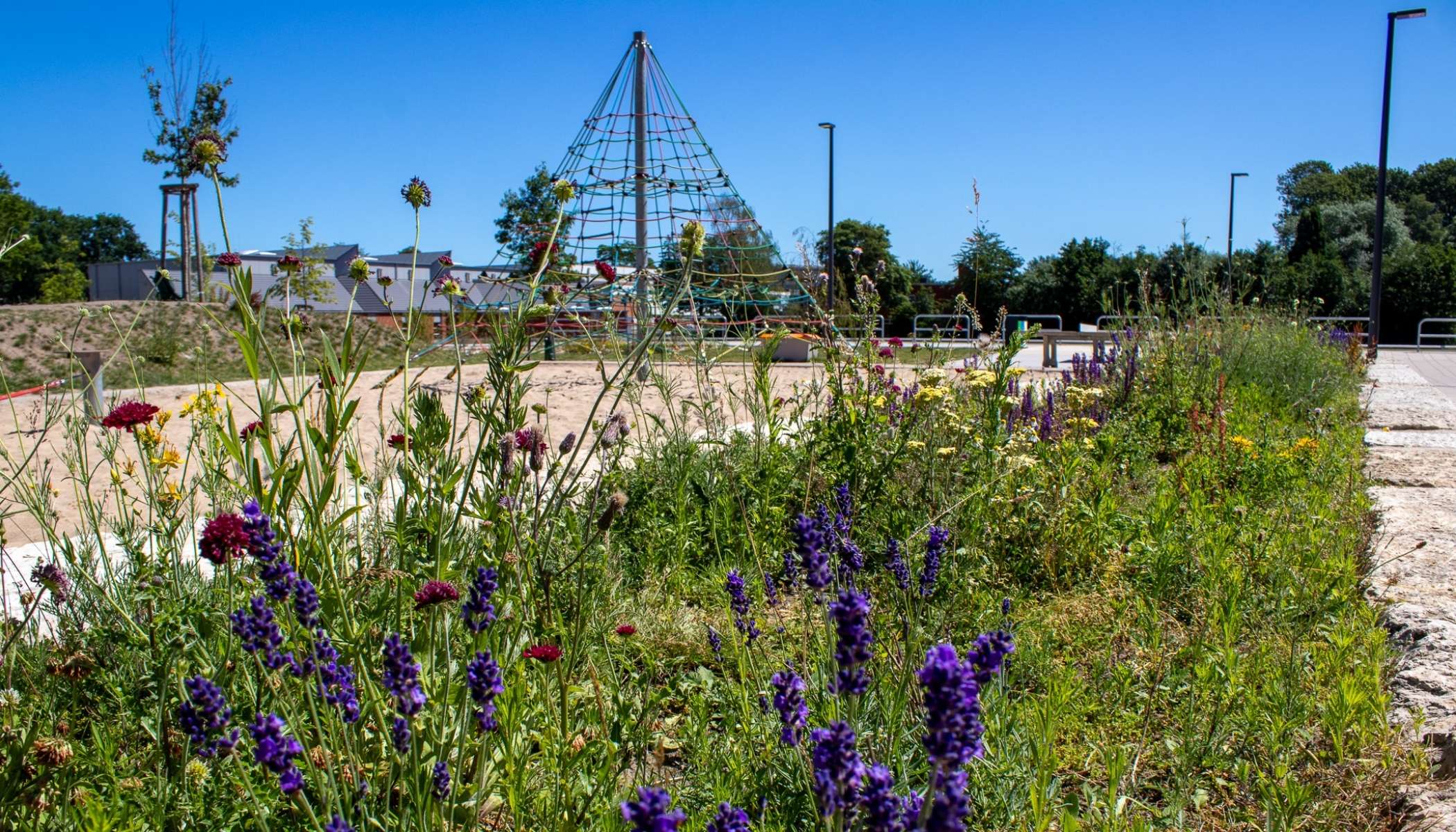 Ein dezentrales Regenwassermanagement mit Mulden Rigolen-Systemen unterstützt die ökologische Bewirtschaftung des Geländes. Ein durchdachtes Beleuchtungskonzept sorgt für Orientierung und Sicherheit.