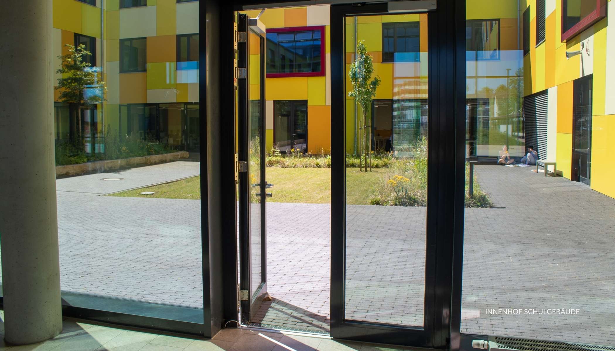 Der Eingangsbereich an der Ludwig-Jahn-Straße mit Bushaltestelle, Mensa und Parklätzen blieb im Wesentlichen unverändert. Neue Wege für Fußgänger und Radfahrende wurden eingerichtet. Das Gymnasium erhält einen gleichsam funktionalen und repräsentativen Eingangsbereich.