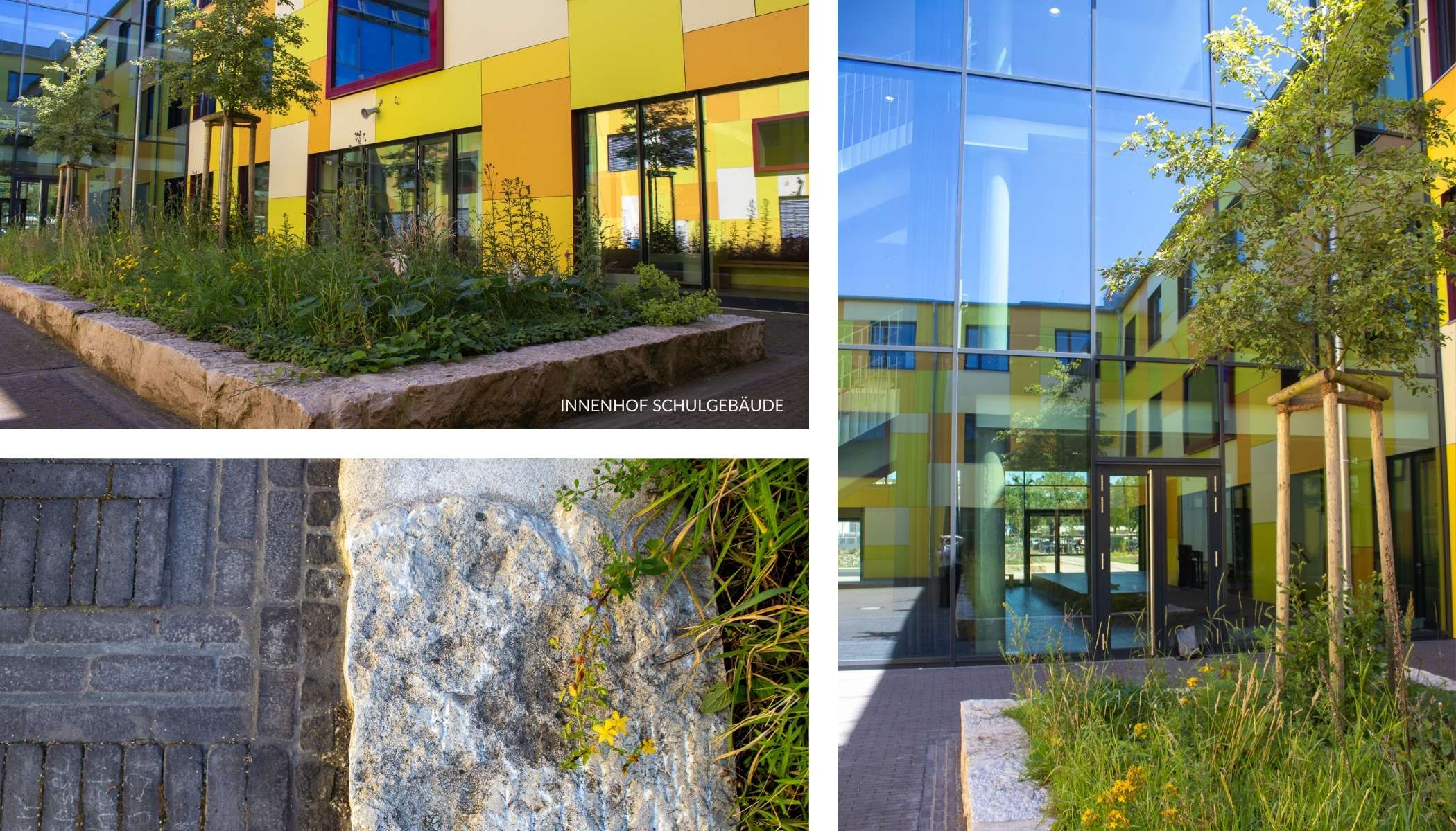 Pergola, hochwertige Beläge und wiederverwendete Sandsteine verbinden Alt und Neu zu einem einheitlichen Gesamtbild. Ergänzt wird dies durch vielfältige Spiel und Sportangebote sowie einen als Freiluftgalerie gestalteten Innenhof.