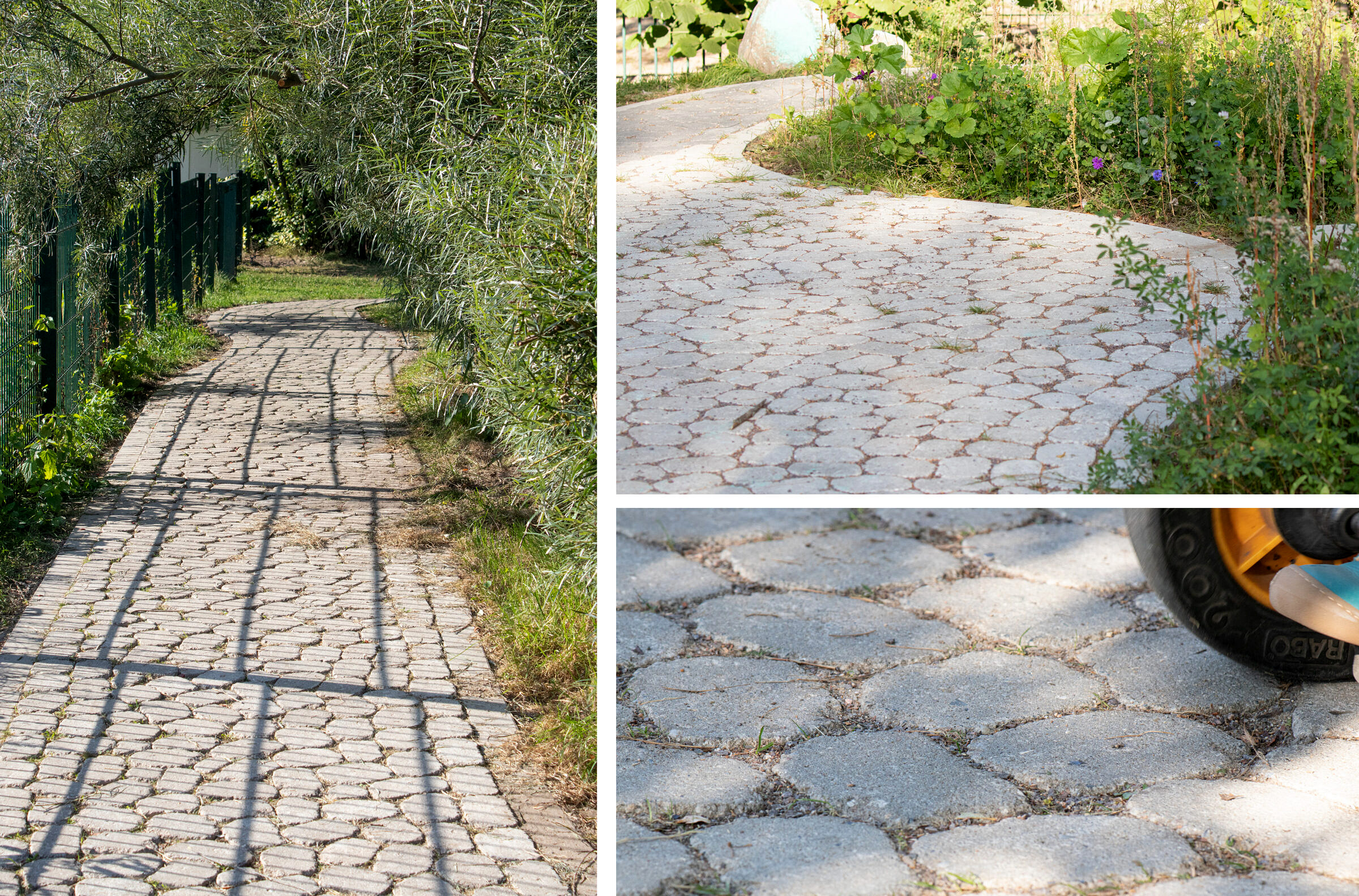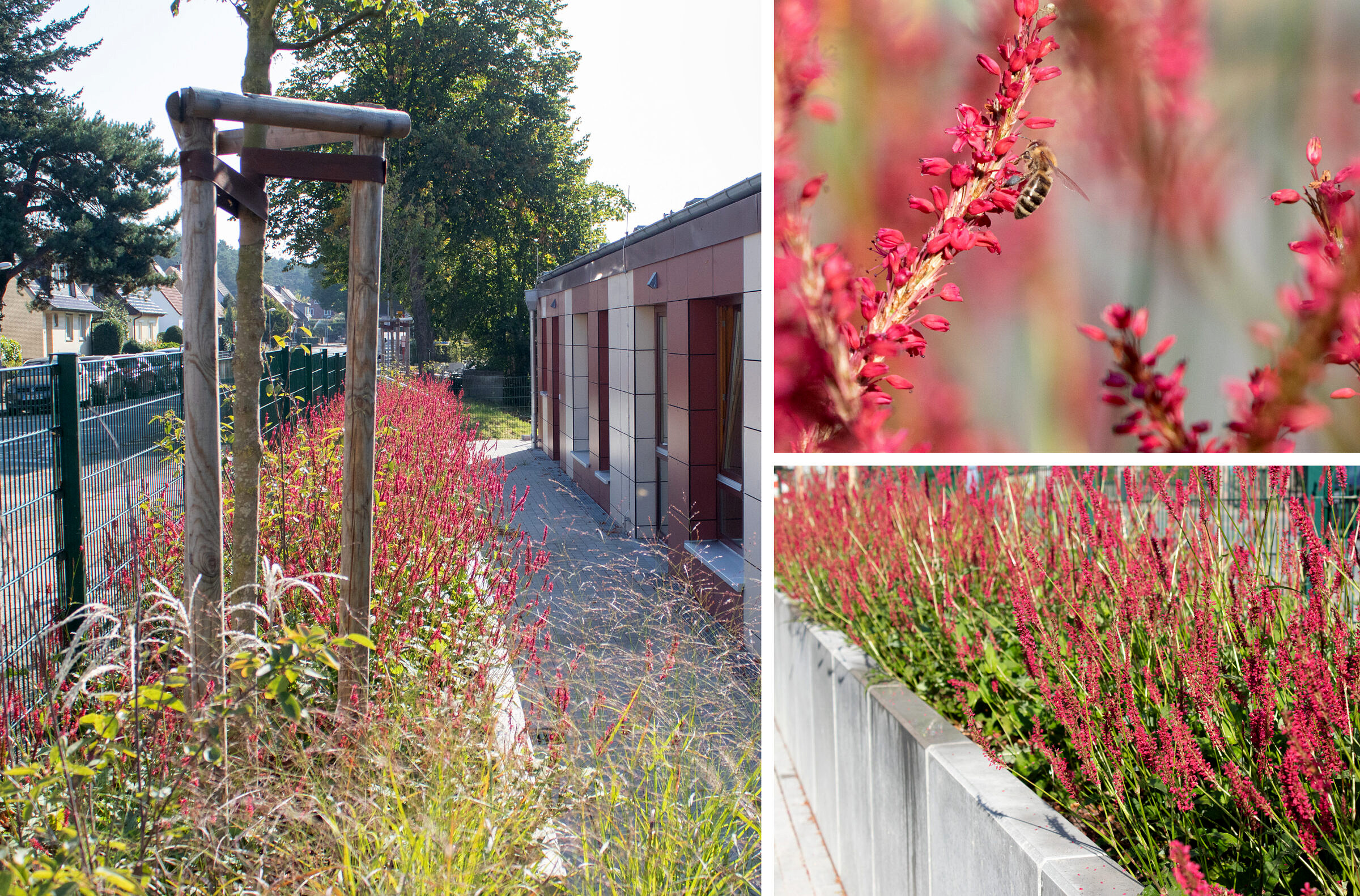 Außerdem wurde ein Schmetterlings- und Insektengarten entworfen, Aufenthaltsflächen am Neubau geschaffen, der Hof mit den alten Walnussbäumen mit einer Rampenanlage für Essenstransporte versehen und zusätzlich ein Wasserspielplatz, Sandspieldorf und ein Gemüse-, Obst- und Blumengarten angelegt. Umrundet wird die gesamte Außenanlage durch die gewünschte Rollbahn.