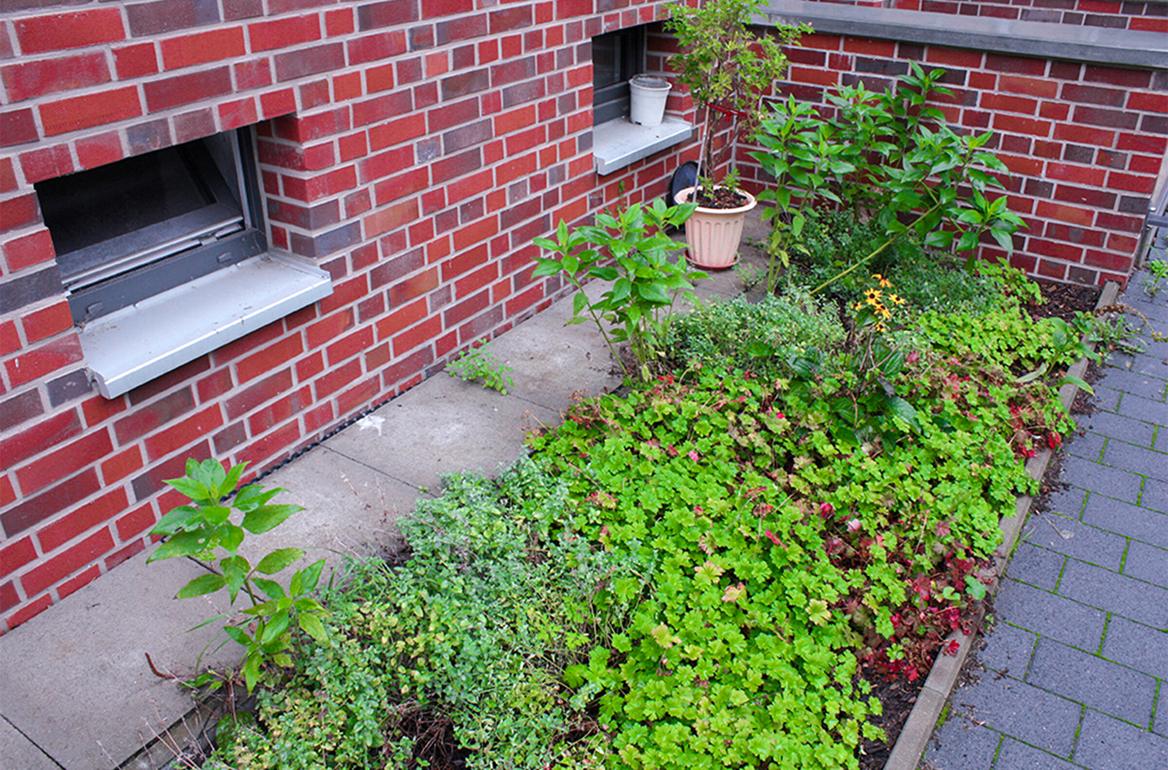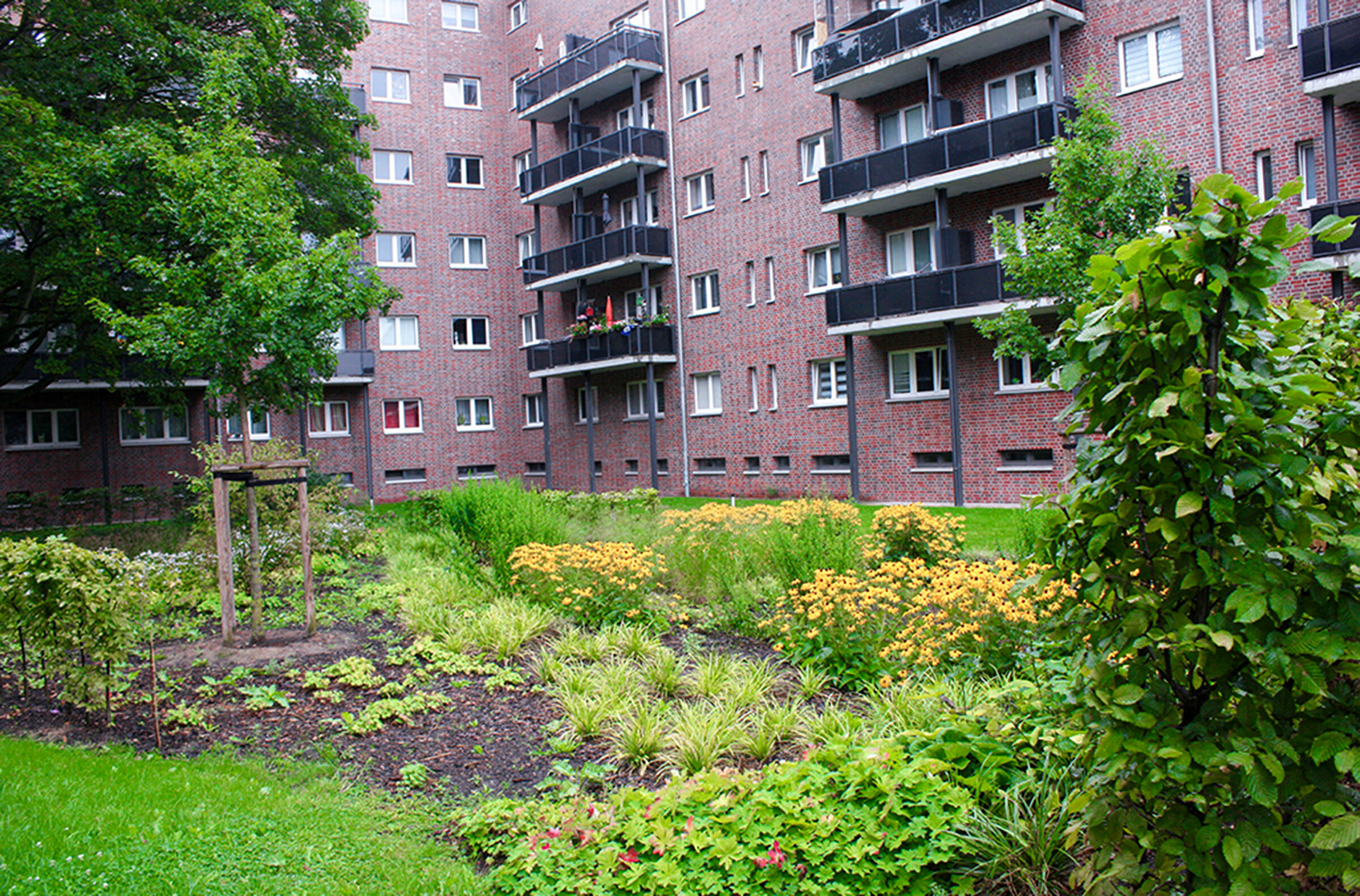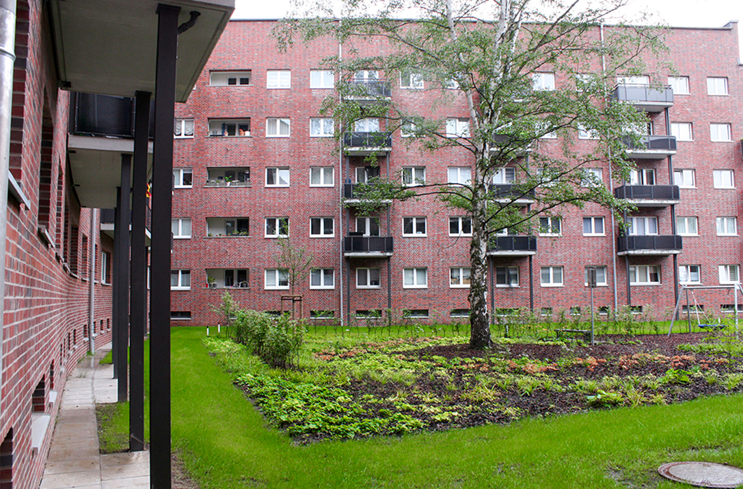 Unsere Schwerpunkte bei der Gestaltung der Außenanlagen lagen in der Neuplanung und Bauüberwachung der Hauseingänge und der Begrünung der Innenhöfe entlang der Wilhelmsburger Straße, die als einladende Aufenthalts- und Spielflächen für alle Anwohner angelegt wurden. Die kammerartige Gebäudestruktur wurde durch raumbildende Hecken und farbenfrohe Pflanzungen aufgelockert.