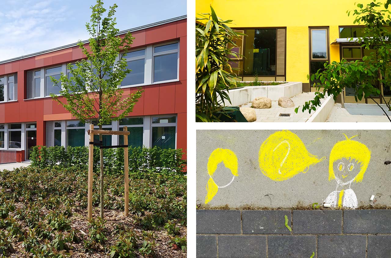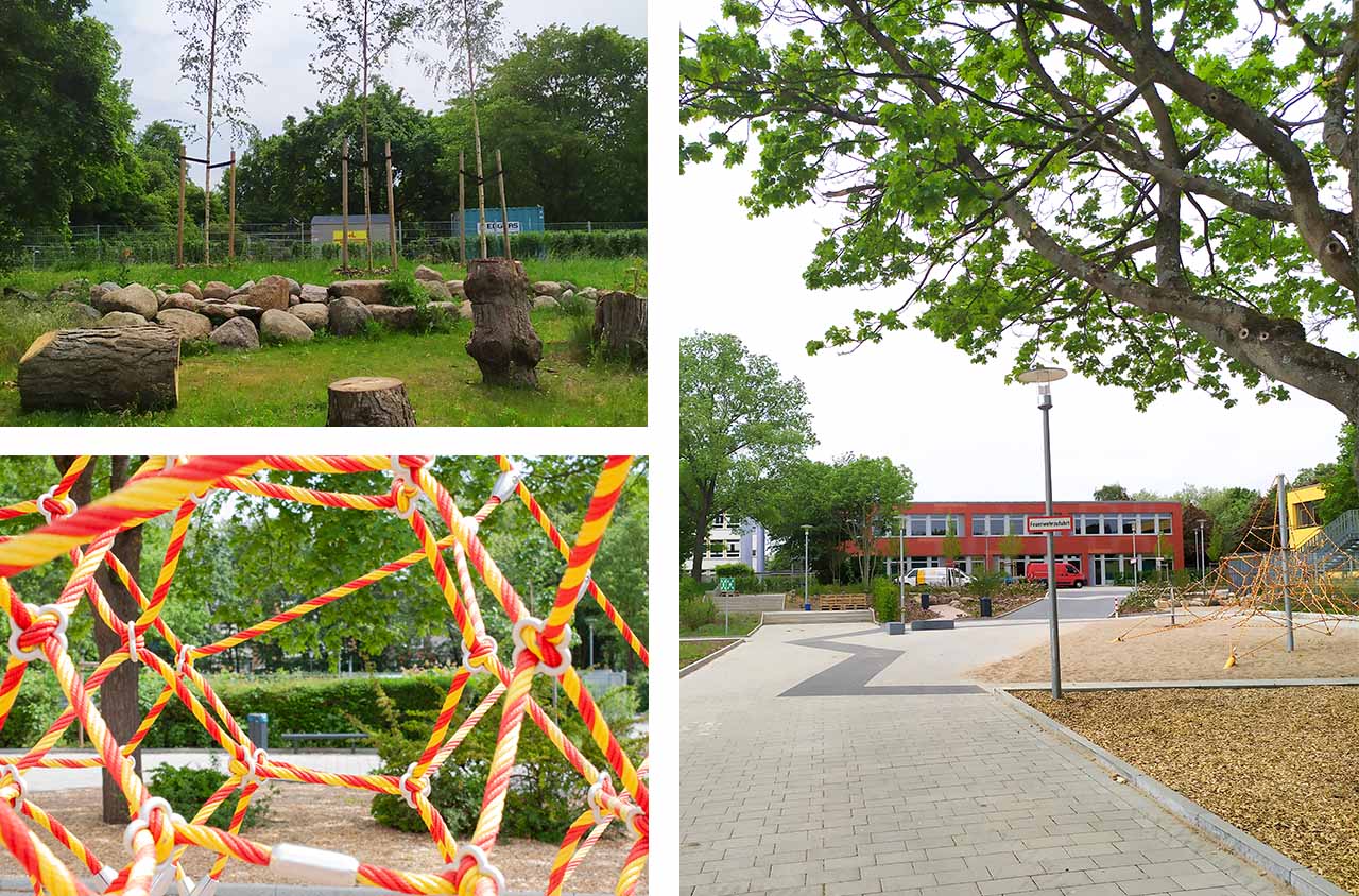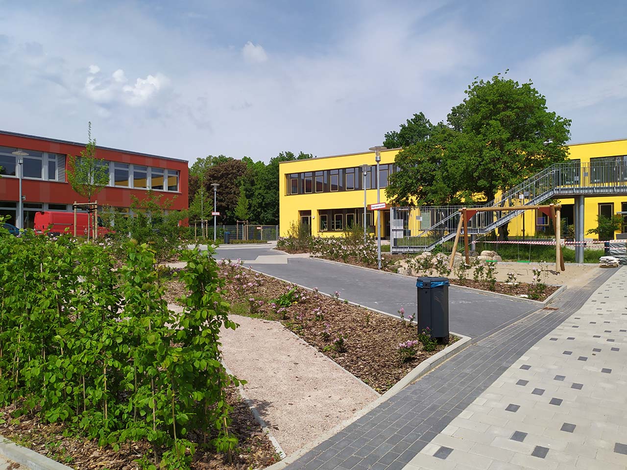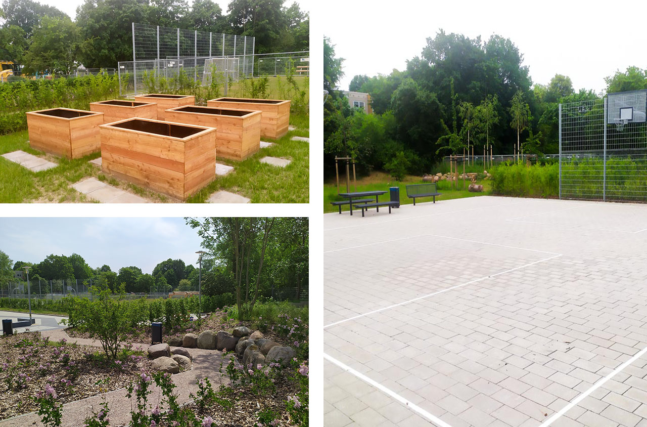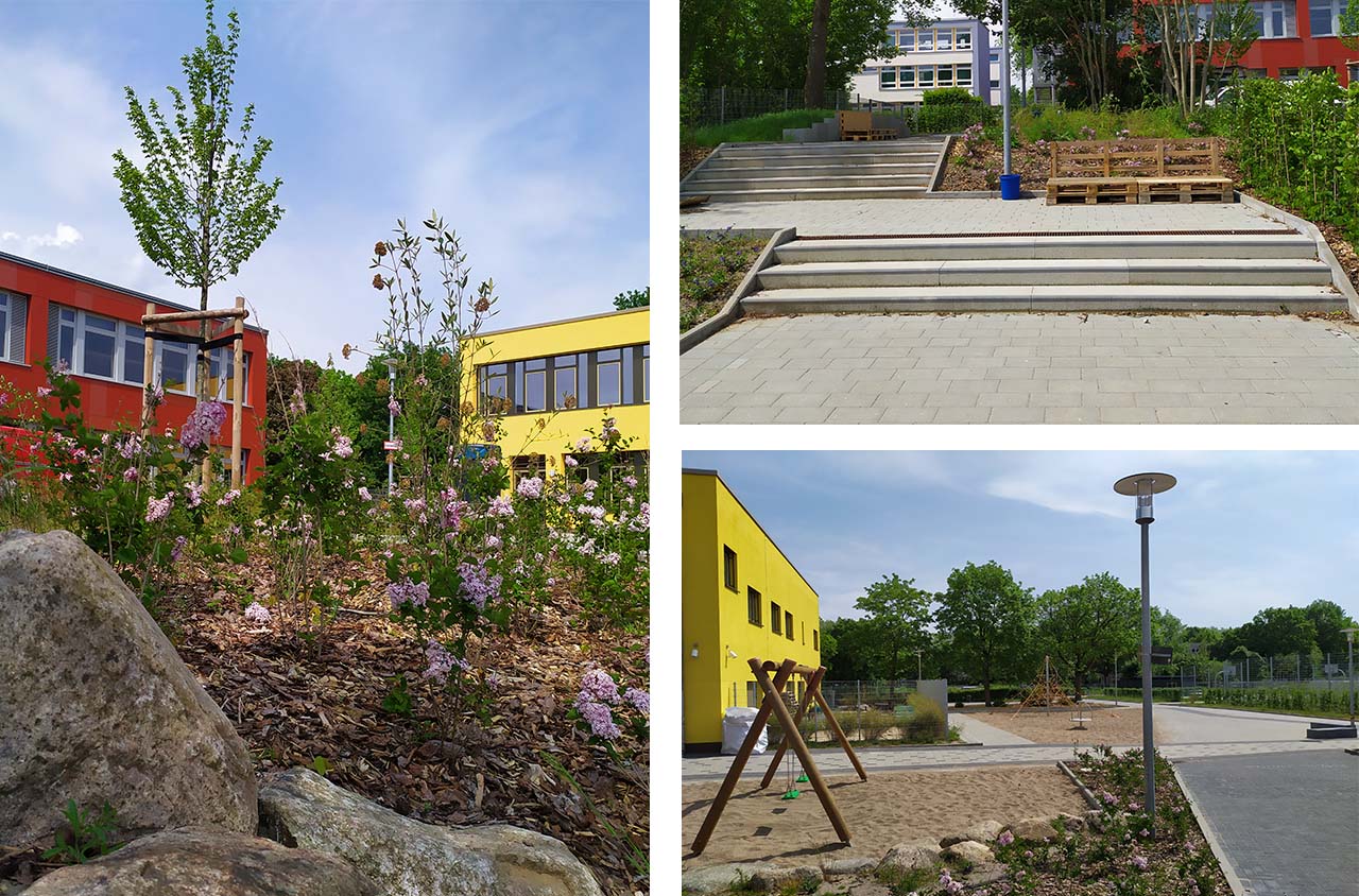 Der dreigliedrige Gemeinschaftsbau für die verschiedenen Einrichtungen erfordert Außenanlagen, die sowohl verbindenden als auch separierenden Charakter haben. In unserem Entwurf wurde in thematische und funktionelle Teilabschnitte gegliedert, aber darauf geachtet, dass die gesamte Neuanlage in einem einheitlichen Belags- und Bepflanzungskonzept angelegt wird. Im Bereich der Schule (ReBBZ) ist ein Mensahof, eine Lehrerterrasse, ein bepflanzter Berghang, mehrere Spiel- und Sportflächen und ein Hochbeetgarten entstanden.