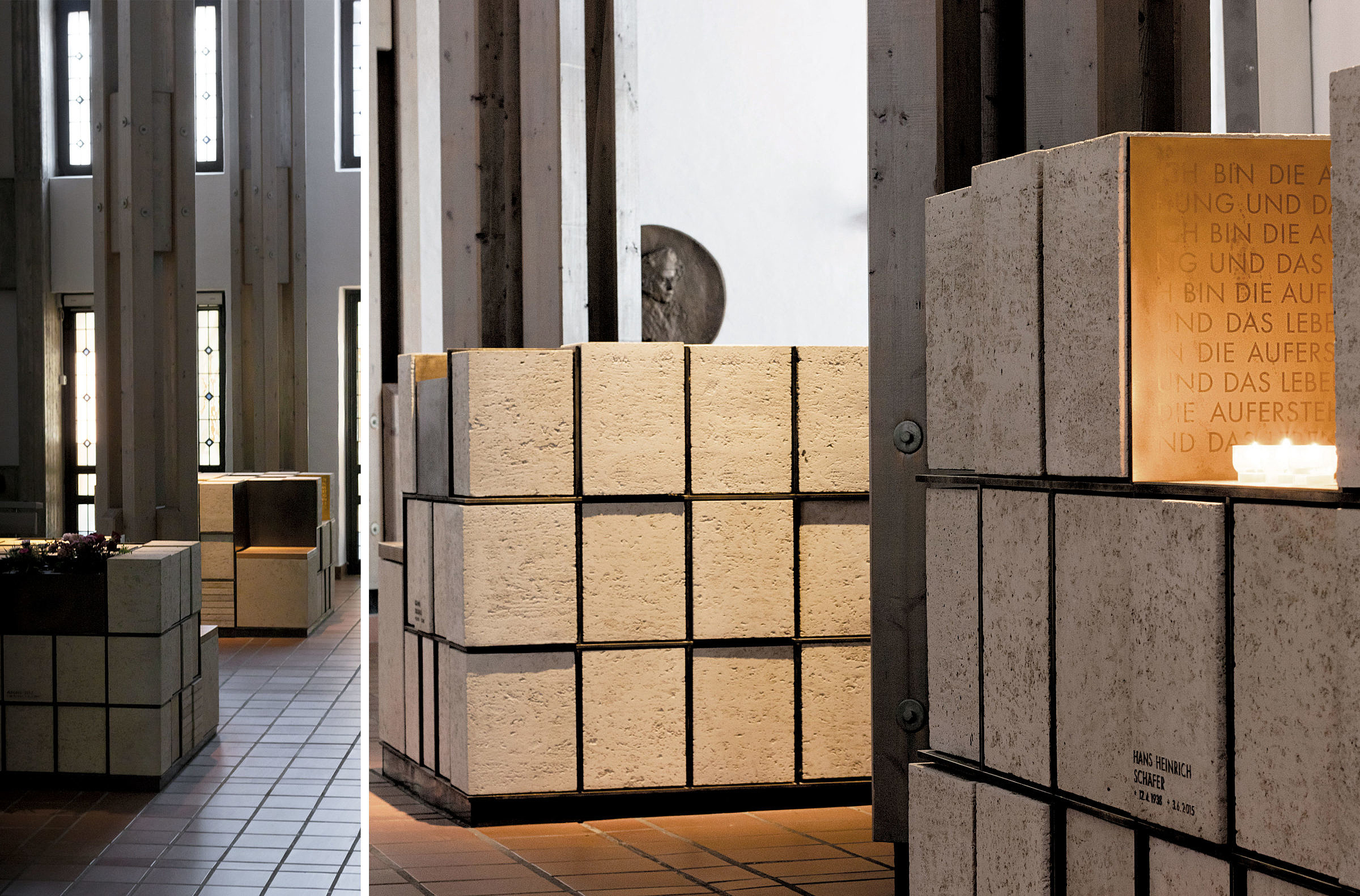 Der Gestaltungswille der Gemeinde hat sich in dem gemeinsamen Entwurf mit dem Architekten Andreas Rowold und der Künstlerin Ricarda Wyrwol fortgesetzt. Die Urnen werden in Blöcken beigesetzt, deren helle Farbe in allen neuen Bauteilen aufgenommen wird. Im Kirchenraum entstehen so helle Inseln.