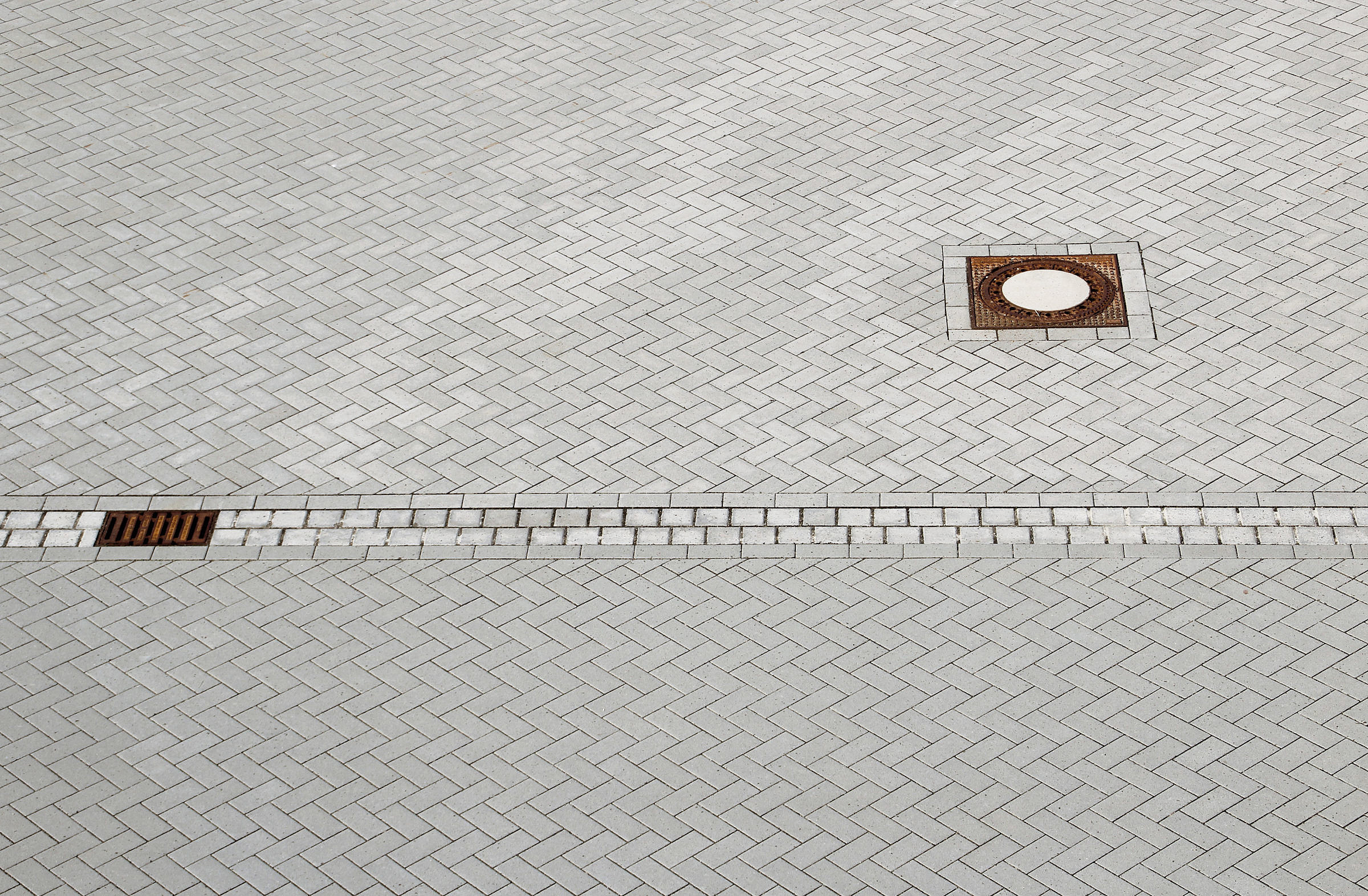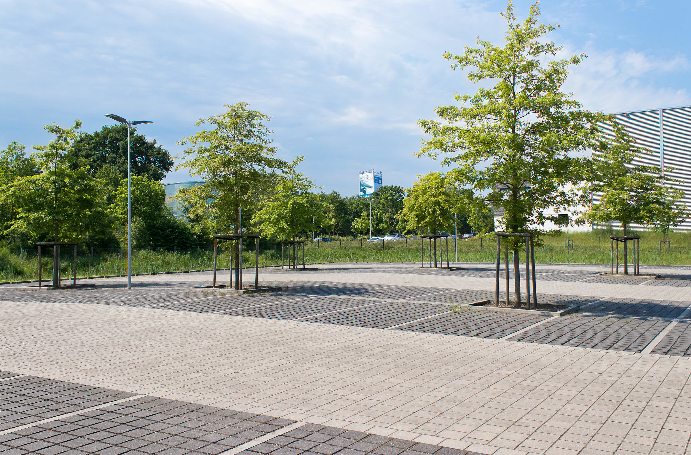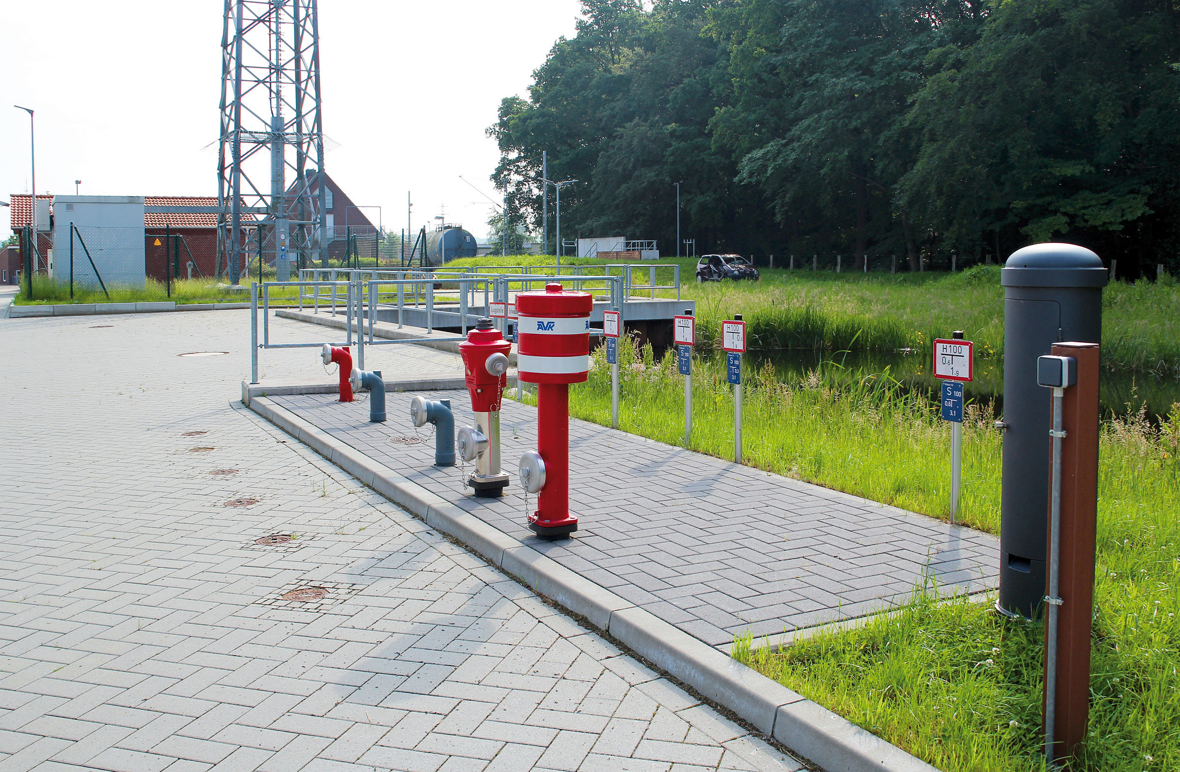 Die Stellplätze für PKW und Großfahrzeuge sind mit Versickerungspflaster ausgeführt. Alle anderen Verkehrsflächen mit Betonpflaster im Fischgrätverband gepflastert. Das Regenwasser wird in einem Grabensystem gesammelt und gereinigt an ein Regenrückhaltebecken abgegeben, welches mit einer Spundwand für Bergeübungen versehen ist.
