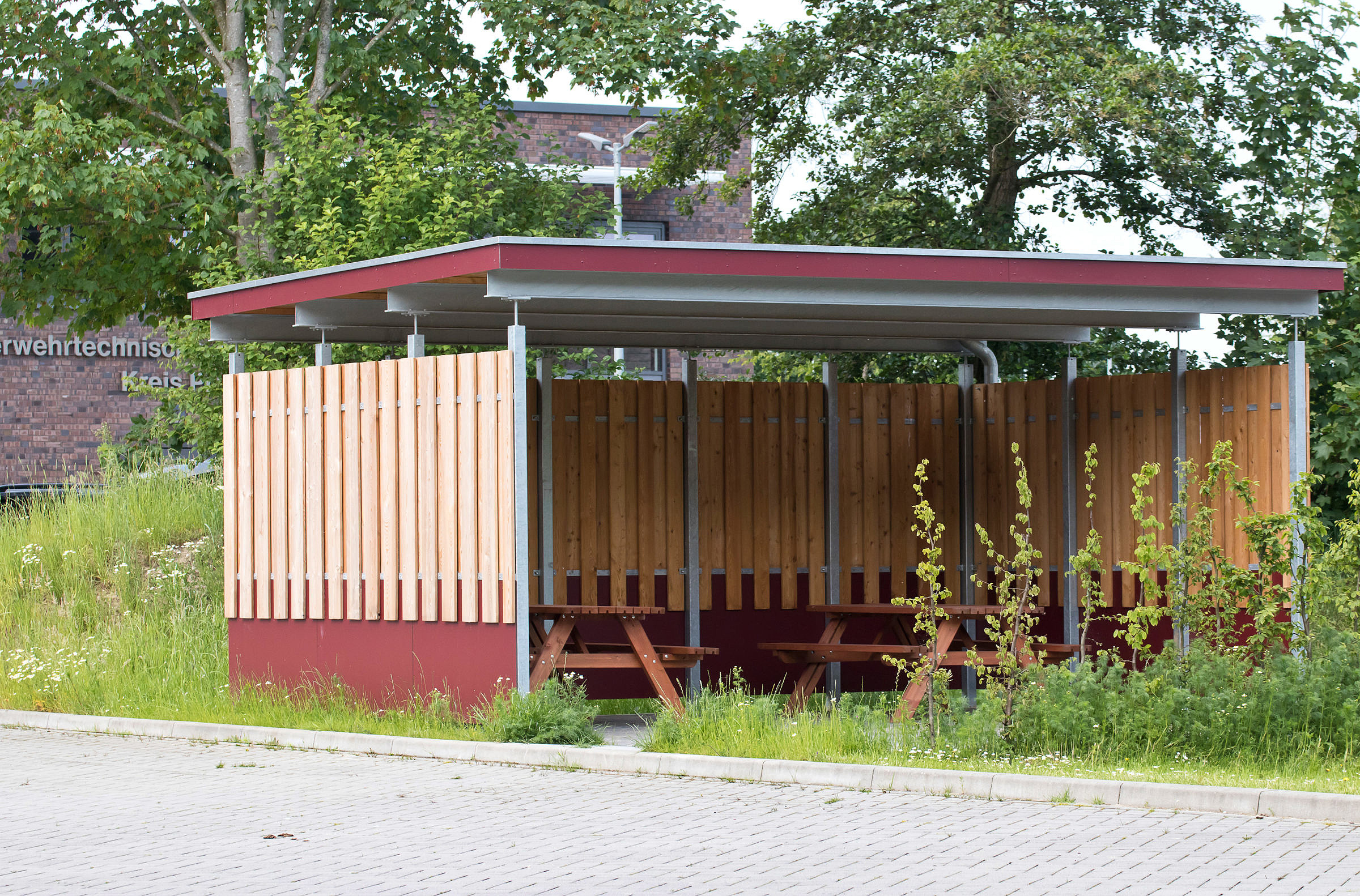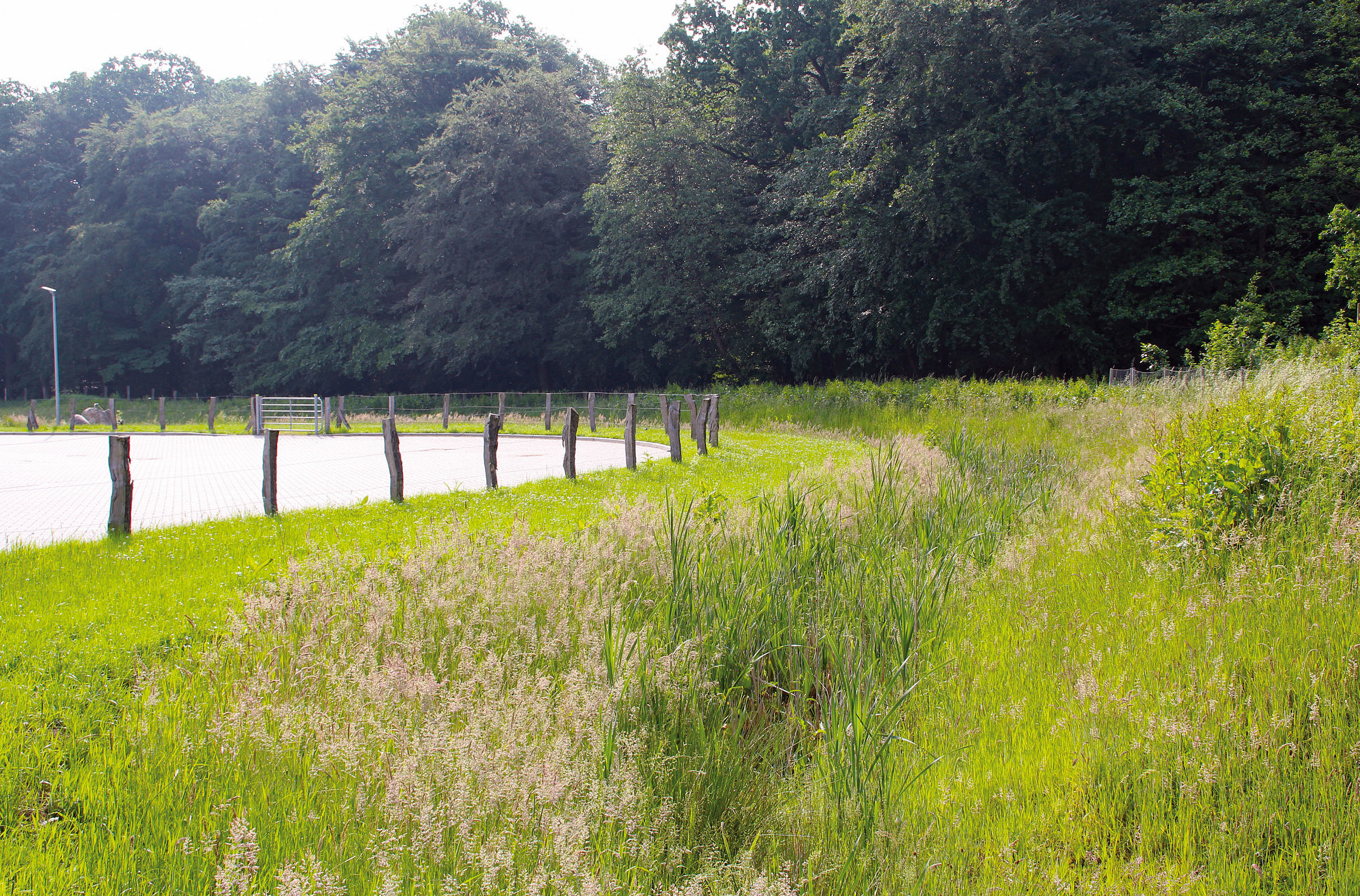 Ergänzt wird die Planung von einem Aufenthaltsbereich mit Pavillon sowie Rasen, Wildrosen- und Baumpflanzungen. Extensive Wiesen und Knickneubepflanzungen machen den Ausgleich der Baumaßnahme auf der Fläche möglich.