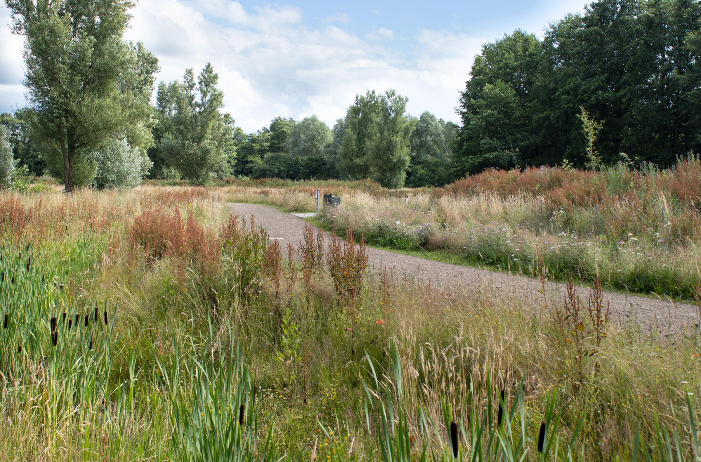 Zur ökologischen Aufwertung erfolgte die Wiederanlage von Feuchtwiesen, Hochstaudenfluren und Landschaftsrasen auf trockeneren Bereichen. Dabei wird eine standorttypische Regio-Saatgutmischung verwendet und der abgeschobene Oberboden mit lokalem Arteninventar wieder eingebracht.