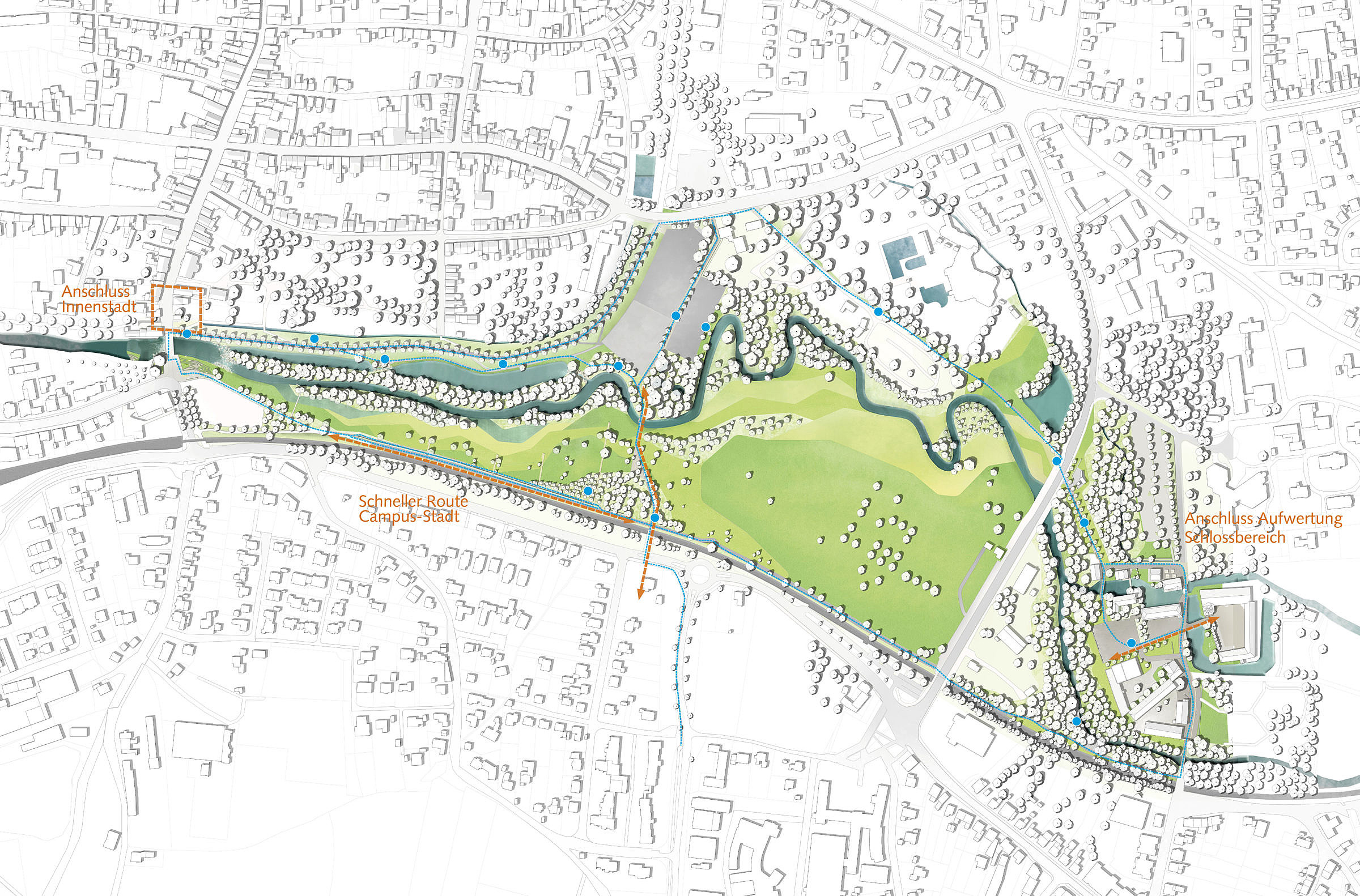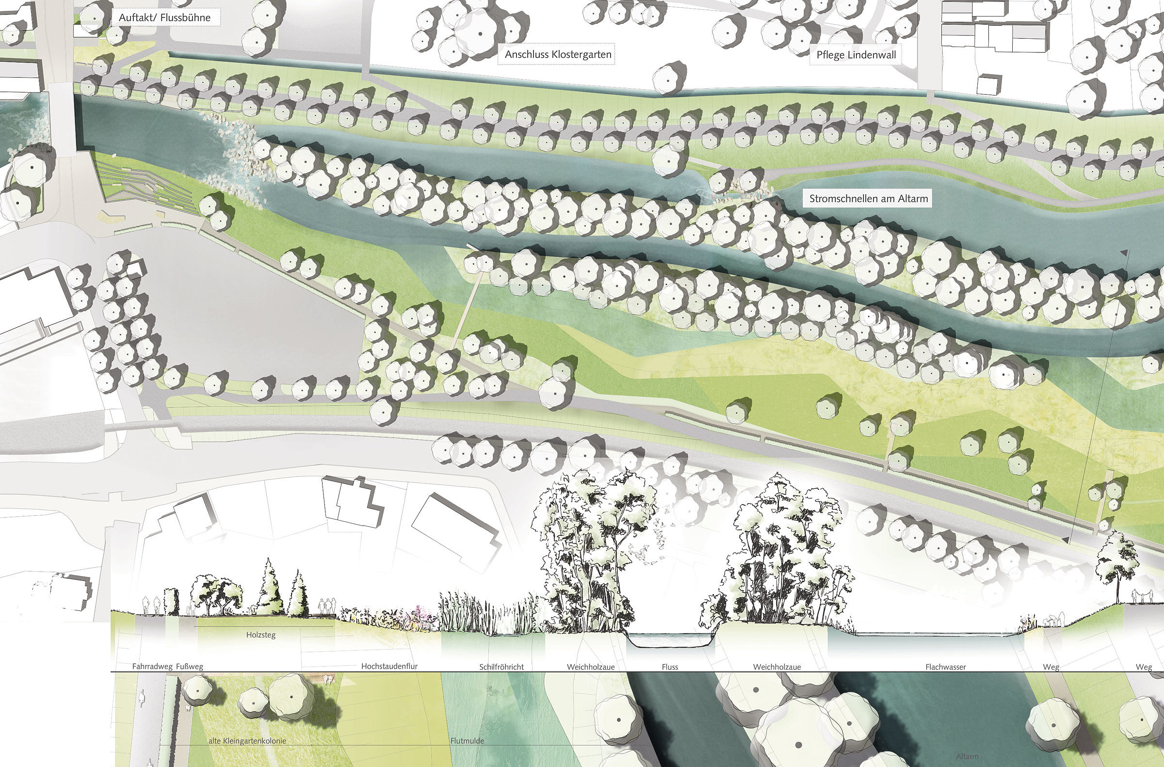 Punktuelle Interventionen führen den Spaziergänger in die Natur und laden zum Aufenthalt ein. So bilden die Stege in der Wiese Sitzgelegenheiten. Die blühenden Bänder der Hochstaudenfluren und das Rauschen in den Bäumen locken zum Naturerlebnis.