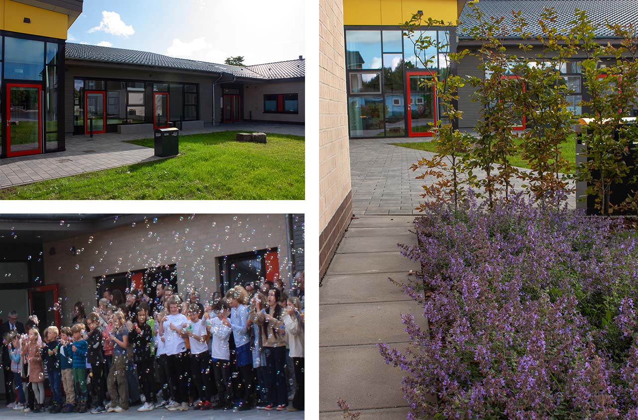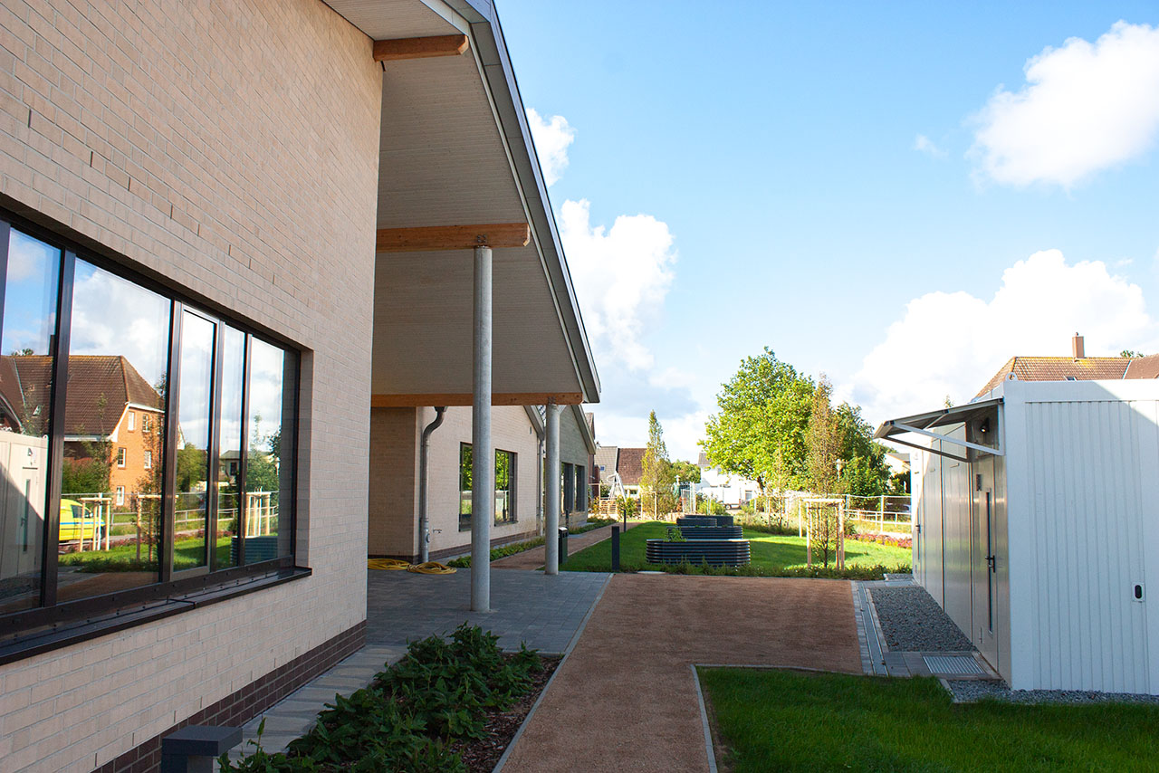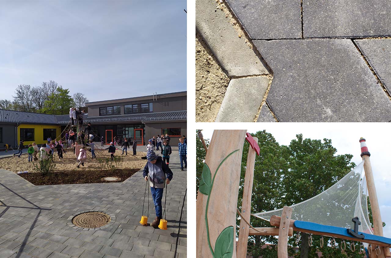 Aufgrund der Dringlichkeit und der zeitlichen Verzögerungen durch den Brand und der daraus folgenden Neuplanungen sind sämtliche Planungs- und Bauprozesse für den Neubau und die Neugestaltung des Schulgeländes innerhalb von drei Jahren abgeschlossen worden. Die Firma Sievers Garten und Landschaft setzte unsere Entwürfe und Ausführungsplanungen für die Freianlagen professionell und mit Liebe zum Detail um. So konnte die Schulleiterin Andrea Vanselow ihr Versprechen an die Viertklässler der Grundschule einhalten, dass sie bis zu den Sommerferien 2023 zumindest für ein paar Monate das neue Schulgebäude erobern und mit Leben füllen konnten. Der Schulhof mit sämtlichen Spiel- und Sportmöglichkeiten wird im Laufe des Sommers 2023 fertiggestellt.