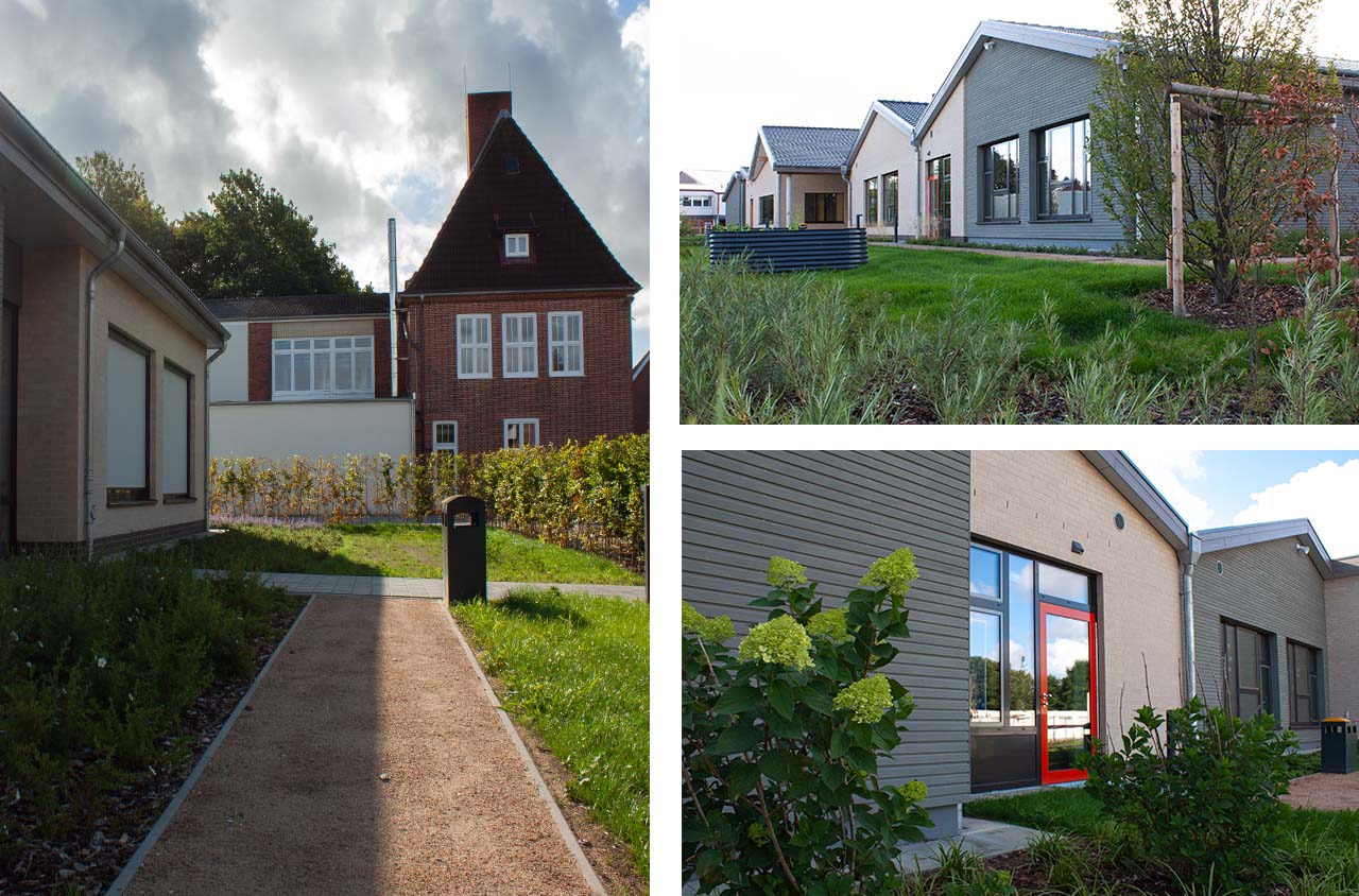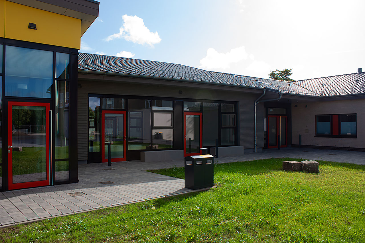 Die Grundschule erhielt Container-Klassenräume als Übergangslösung und ein mittig gelegener zeitgenössischer Neubau für die Grundschule wurde komplett neu beplant. Dieser hebt sich vom Gesamtensemble des öffentlichen Geländes aus Offener Ganztagsschule (OGS), Sporthalle, Volkshochschule, Bücherei und Mehrzweckhalle aus den 1960er und 70er Jahren ab, ist in der Mitte platziert und erfährt eine städtebauliche und architektonische Neuorientierung. Farbenfrohe Holzfassaden prägen das moderne Erscheinungsbild des Schulneubaus.